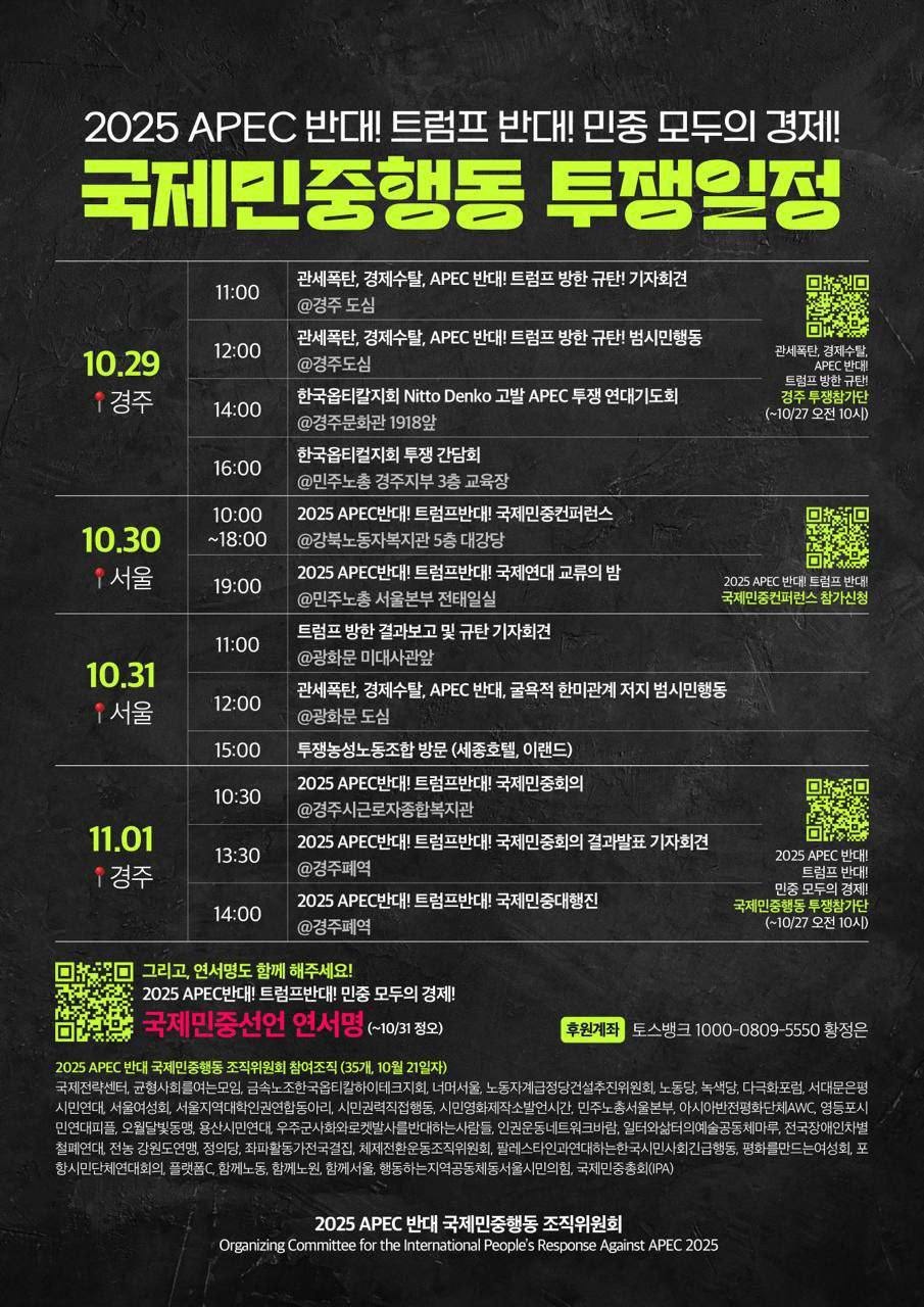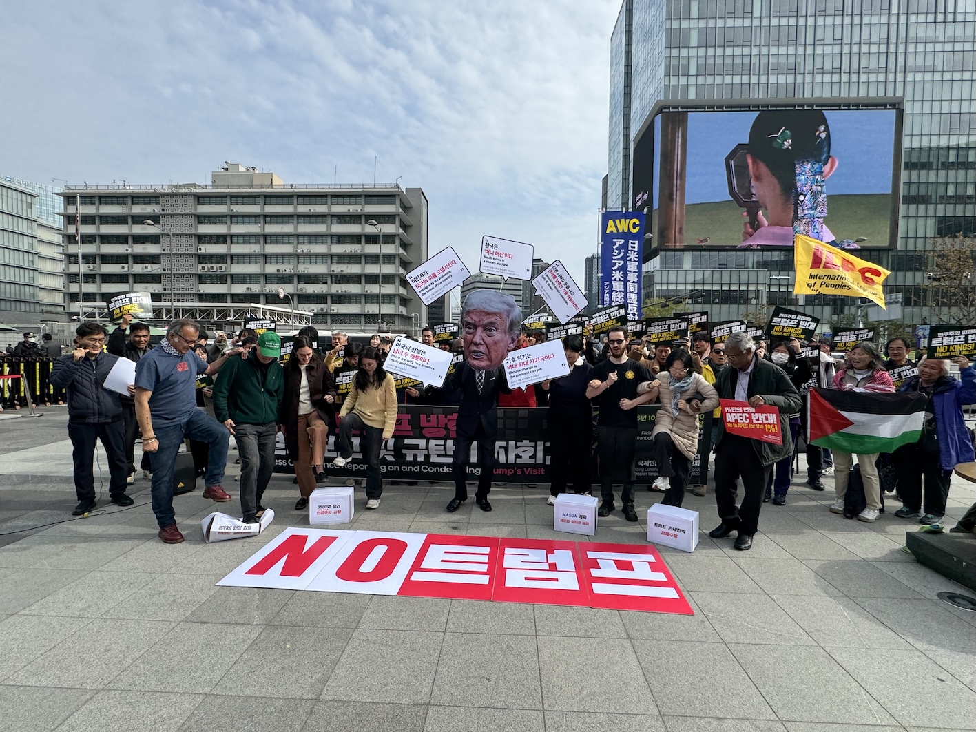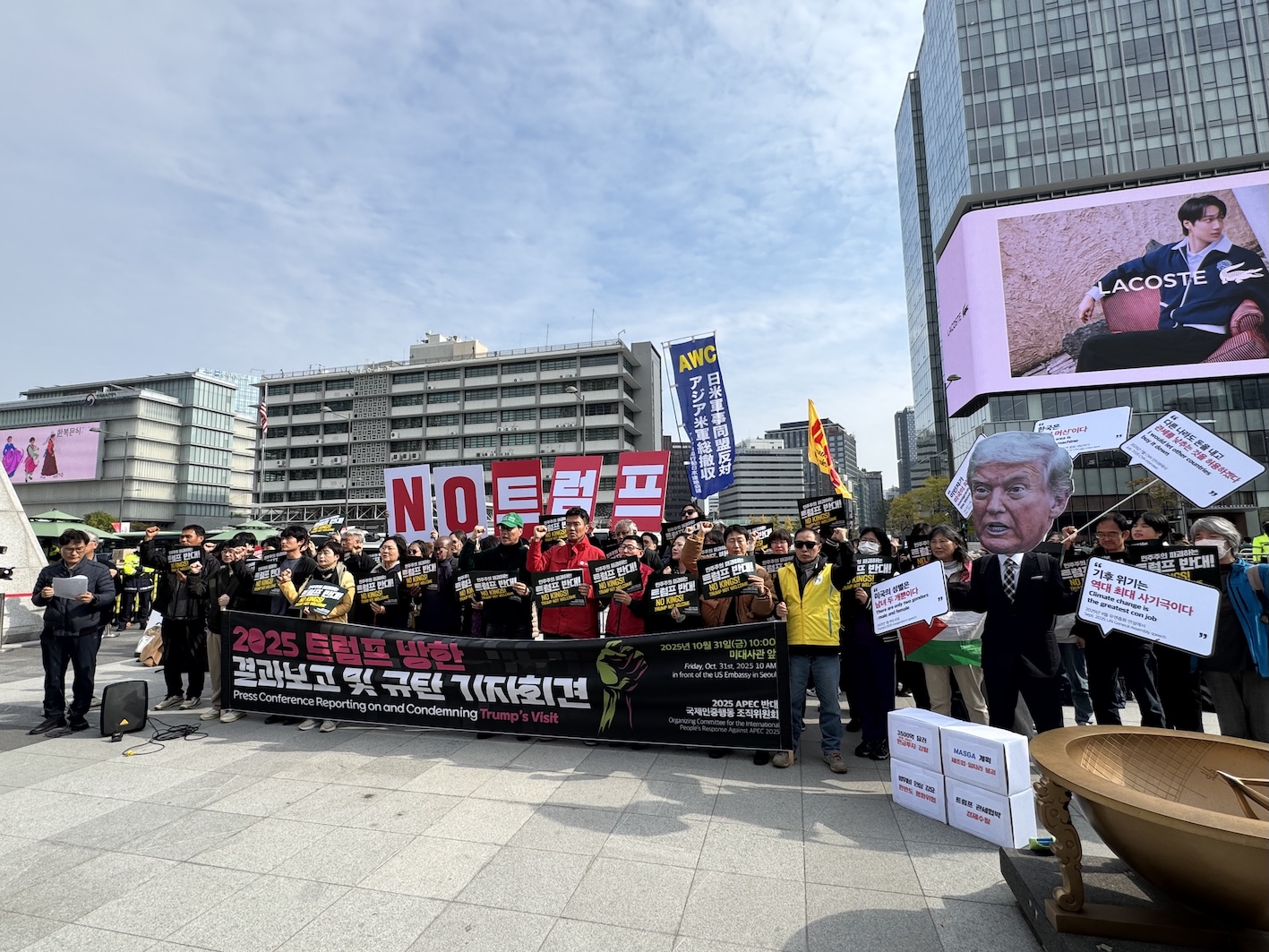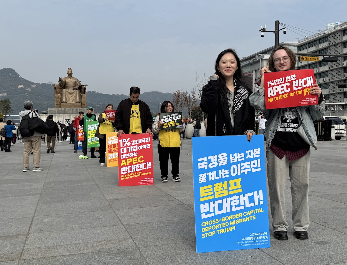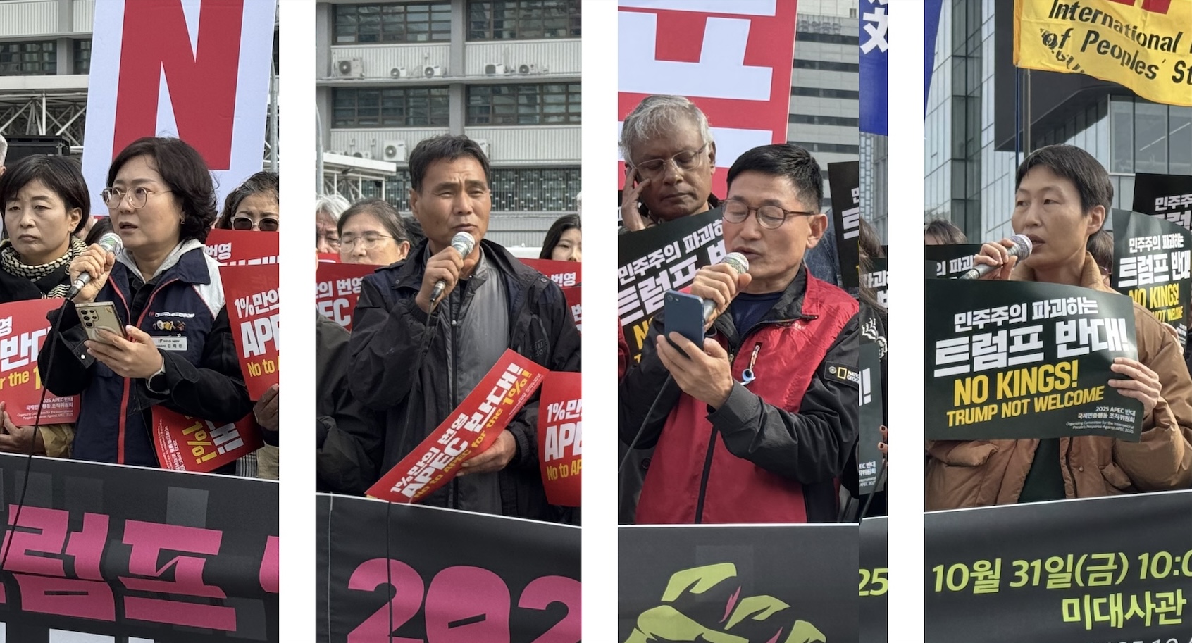 기자회견을 마친 국제민중행동 활동가들은 광화문 광장에서 APEC 규탄 범시민행동 피켓팅을 이어가고, 오후에는 세종호텔 해고노동자 고공농성 현장과 이랜드노동조합 농성장 등 한국 노동사회운동의 투쟁 현장을 찾았다. APEC 정상회의가 열리는 11월 1일에는 경주에서 ‘국제민중회의’와 ‘국제민중대행진’을 진행해 초국적 자본들의 이윤만을 앞세워 전 세계 민중들의 일과 삶을 파괴하는 데 힘을 쏟는 트럼프와 APEC, 이에 동조하는 이재명 정부에 맞선 국제적 연대의 물결을 이어갈 계획이다.
