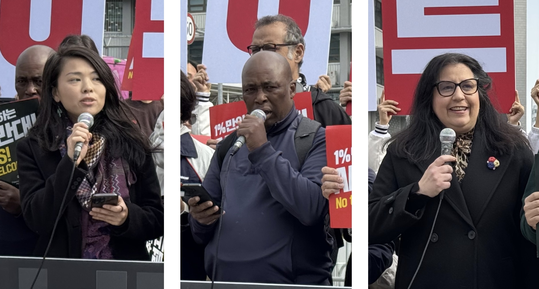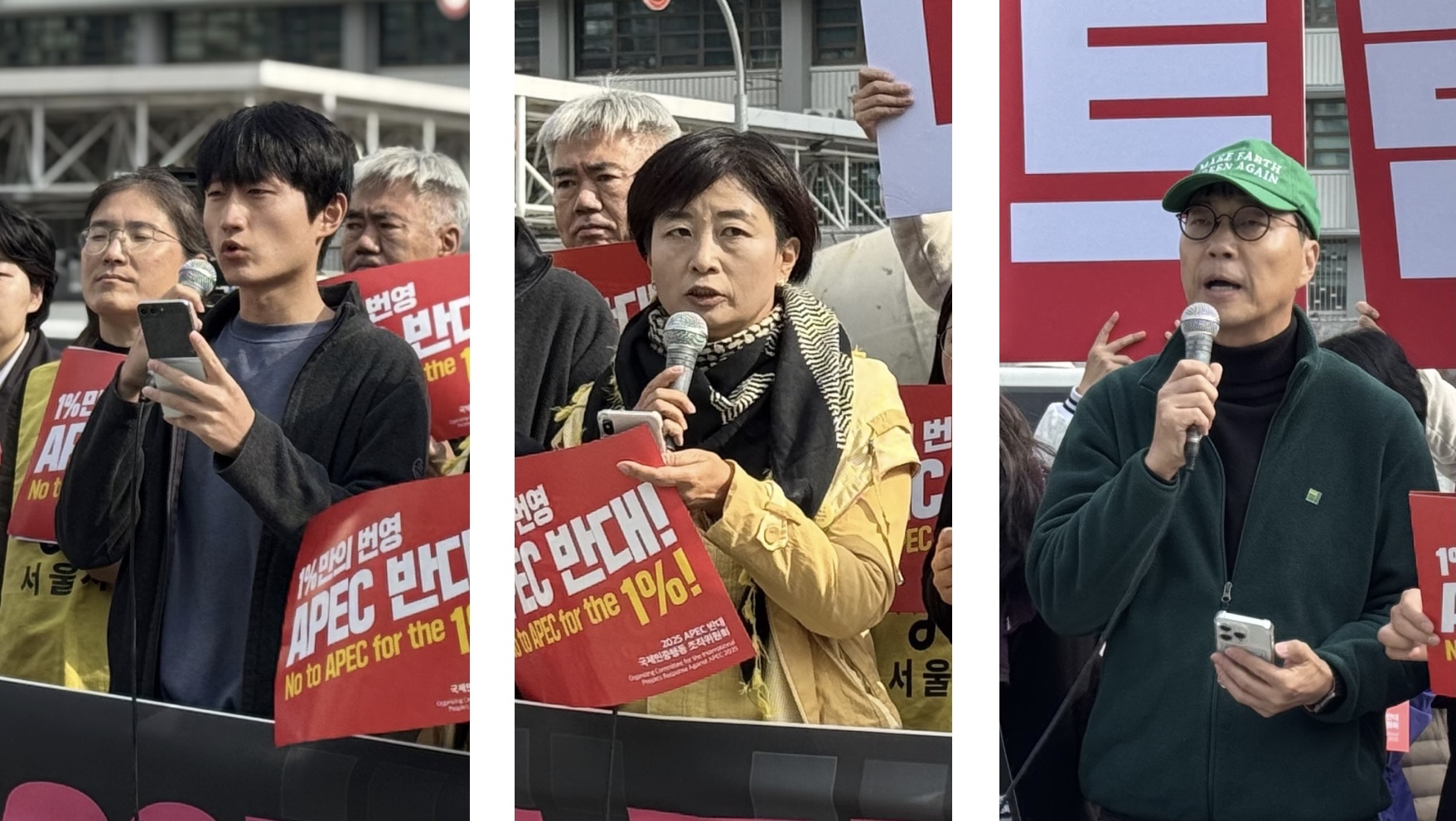 팅스 챠크(Tings Chak) 국제민중총회(IPA) 활동가는 트럼프 백악관은 “베네수엘라에서 콜롬비아에 이르기까지 민간인을 폭격하고 살상하며, 팔레스타인에서의 집단학살을 계속해서 지원”하는 동시에 “신냉전 체제를 밀어붙이고 있다”면서 국제사회에서 미국 정부는 “경제적이든, 정치적이든, 군사적이든, 대등한 협상을 하는 정부가 아니며, “주권을 존중하지도 않고, 공동의 가치를 존중하지도 않으며, 그 대신 전 세계 나라들에게 복종과 조공을 요구한다”고 지적했다. 그는 이어서 “우리는 아시아와 글로벌 사우스의 많은 정부들이 우리의 권리, 평화롭고 자립적인 발전의 권리를 지키는 대신 미국의 지배에 굴복해 왔음을 보아왔다”며 “그렇기 때문에 우리는 민중으로서, 우리의 정부가 하지 않는 요구를 우리가 직접 하기 위해, 그리고 한국에 강요된 불평등한 협정들이 상징하는 지배와 종속의 체제를 규탄하기 위해 이 자리에 섰다”고 밝혔다.