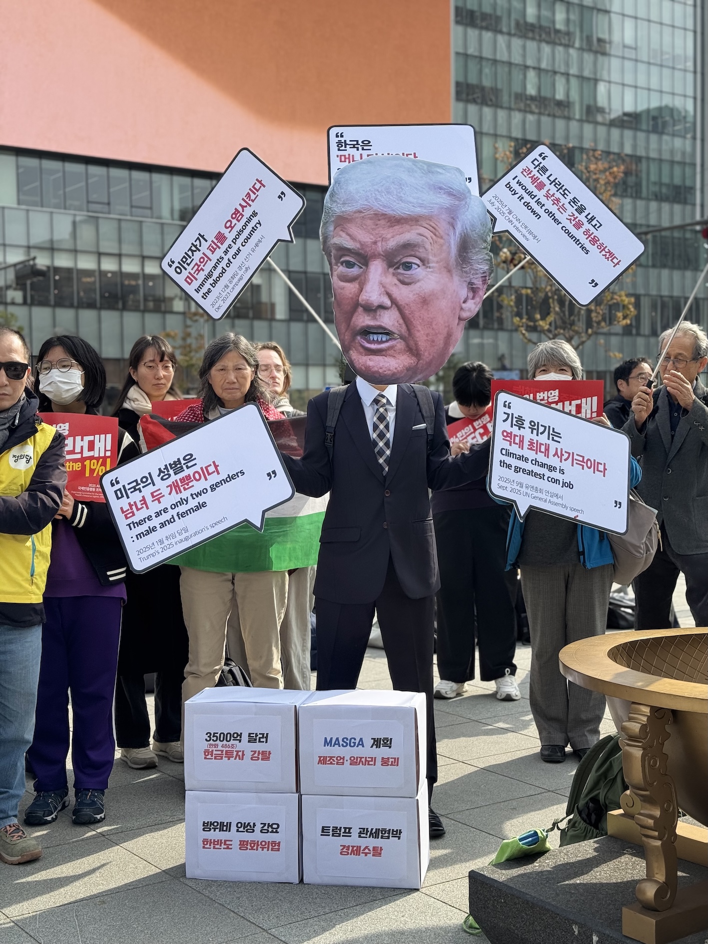 "트럼프 방한 결과보고 및 규탄 기자회견", 트럼프의 약탈적 신자유주의 정책에 맞선 민중들의 연대를 표현한 퍼포먼스. 참세상