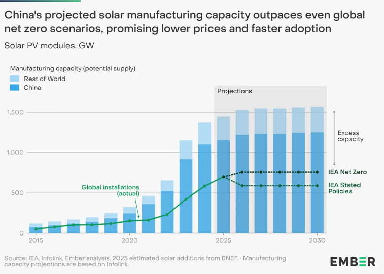 아무리 자주 말해도 지나치지 않다중국의 녹색 에너지 설비 확장특히 태양광(PV) 생산 능력 확대는 세상을 바꿔놓고 있다현재 중국은 혼자만으로도 이산화탄소 순배출 제로(Net Zero)를 위한 최적화된’ 경로에 필요한 태양광 패널 생산 능력보다 50% 이상 많은 생산 능력을 갖췄다중국산 패널을 원치 않는 사람들까지 고려해 전 세계의 생산량을 합치면우리는 필요량의 두 배에 해당하는 생산 능력을 확보했다.