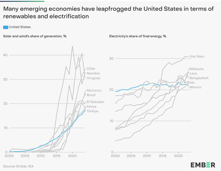 중국 밖에서는최근 EMBER의 데이터가 보여주듯 저렴한 재생에너지가 빠르게 성장하는 신흥 시장들이 미국을 추월하도록 돕고 있다전력화 수준과 재생에너지 비중 모두에서 그렇다.