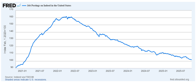 하지만 나는 그 반대편, 즉 채용 감소 쪽을 더 우려하고 있다. 그 근거로 나는 인디드(Indeed)의 채용지수를 든다. 가이 역시 이 지수를 언급하지만, 그는 우리가 지난 3년 반 동안 이어져 온 완만한 하락 추세 위에 여전히 놓여 있을 뿐이라고 본다. 그러나 내가 보기에는 이 하락세가 단순한 ‘완만한 추세선’이라기보다는, 노동시장이 점점 더 냉각되고 있다는 신호처럼 보인다.