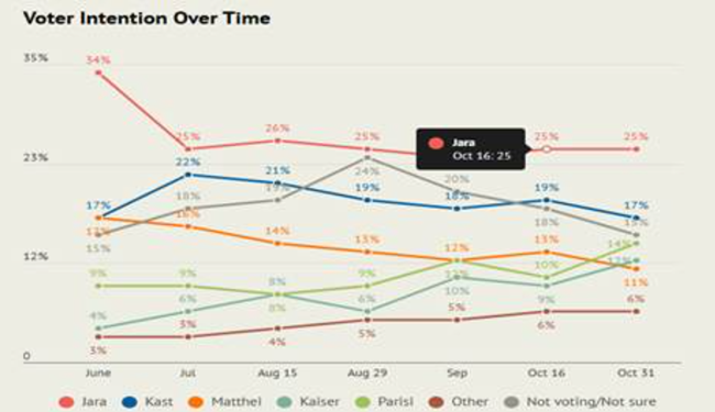 보리치는 2021년 선거에서 결정적인 승리를 거둔 전직 학생운동가였다투표가 의무가 아닌 자발적 방식으로 바뀐 이후 최고 수준인 56%의 투표율 속에서 당시 35세였던 보리치는 극우 정치인 호세 안토니오 카스트의 44%에 맞서 56%를 득표했다그러나 이번에는 득표 비율이 반대가 될 수도 있다보리치의 노동부 장관을 지낸 공산당의 히아네트 하라가 이끄는 좌파 연합이 여론조사에서는 앞서고 있지만그는 보리치가 그랬던 것처럼 1차 투표에서 과반을 얻지 못할 것이다그리고 여러 우파 정당들이 표를 결집해 12월 2차 결선투표에서 카스트를 대통령 자리에 올릴 가능성이 크다.