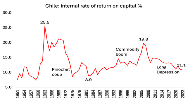 칠레의 상대적 경제 성과는 항상 구리와 광물 수출에 기반해왔다칠레는 30년 넘게 세계 최대 구리 생산국이었고국가 전체 수출의 약 50%가 구리 관련 제품에서 나온다광업 부문은 칠레 GDP의 15%를 차지하며 20만 개의 일자리를 창출한다구리와 광물 가격이 높고 상승할 때 칠레 경제는 더 좋은 성과를 내고그 반대일 때는 악화한다아래 그래프가 보여주듯이 칠레 자본의 수익성은 구리 가격 순환에 의해 움직여왔다.
