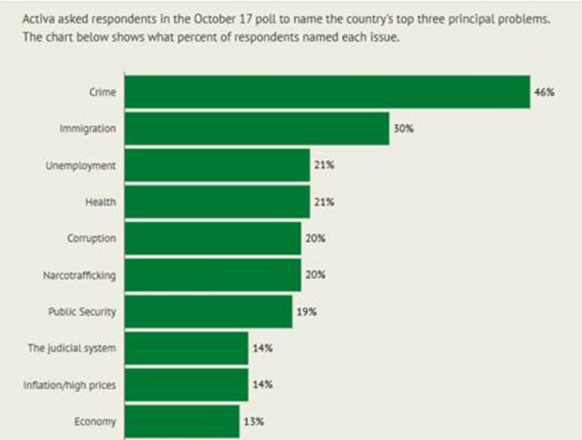 Activa는 10월 17일 실시한 여론조사에서 응답자들에게 나라의 가장 중요한 세 가지 문제를 꼽도록 요청했다. 아래 차트는 각 문제를 지목한 응답자 비율을 보여준다. 범죄 46%, 이민 30%, 실업 21%, 보건 21%, 부패 20%, 마약 밀매 20%, 공공 안전 19%, 사법 제도 14%, 인플레이션/고물가 14%, 경제 13%
