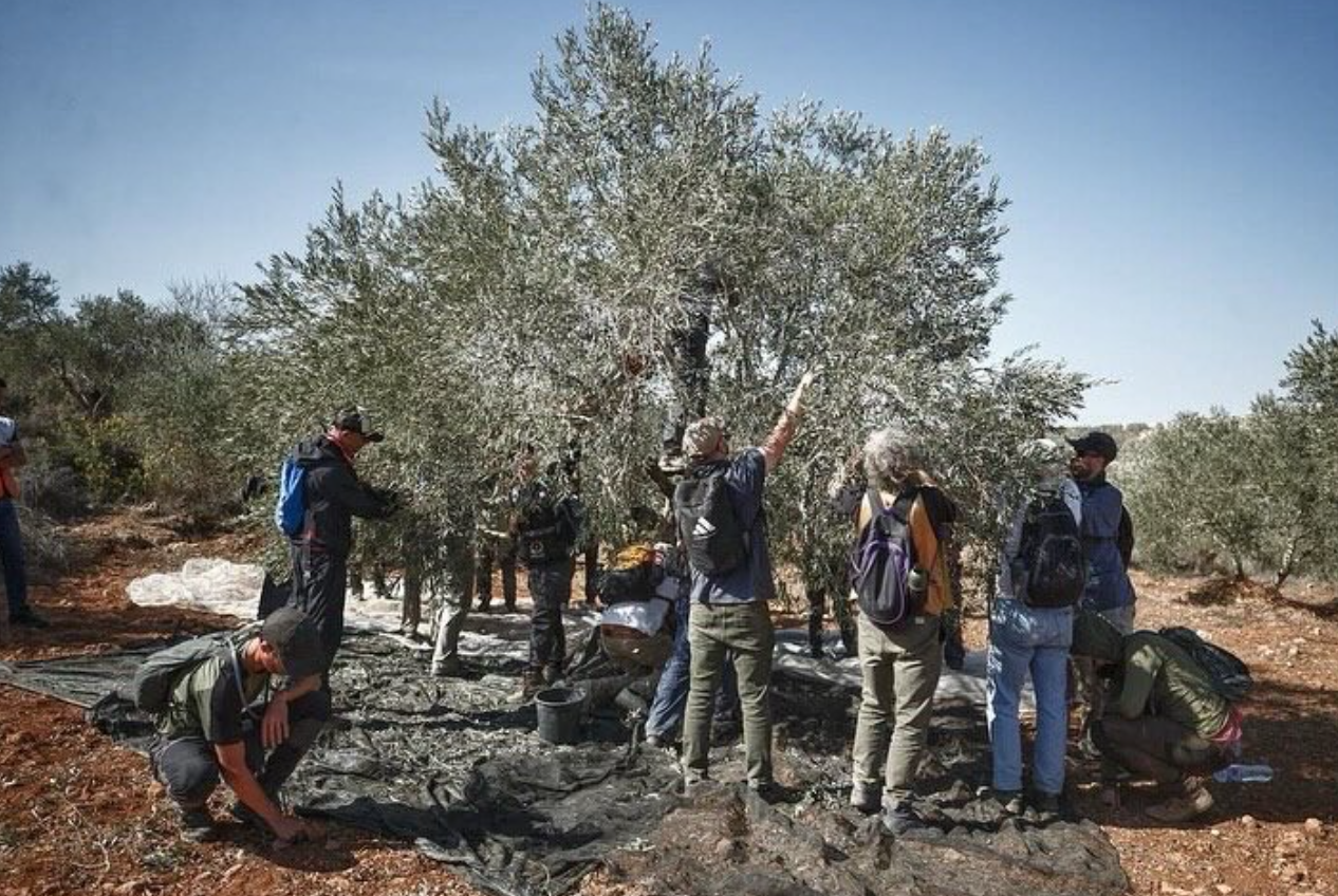 지난 10월, 이스라엘의 방해 시도에도 불구하고 베이타(Beita) 주민들은 외국인 활동가들과 함께 올리브 수확철 동안 공격이 계속되고 있는 정착민들의 폭력 속에서도 자발 카마스(Jabal Qamas)에서 일부 올리브를 수확했다. 출처: Eye on Palestine