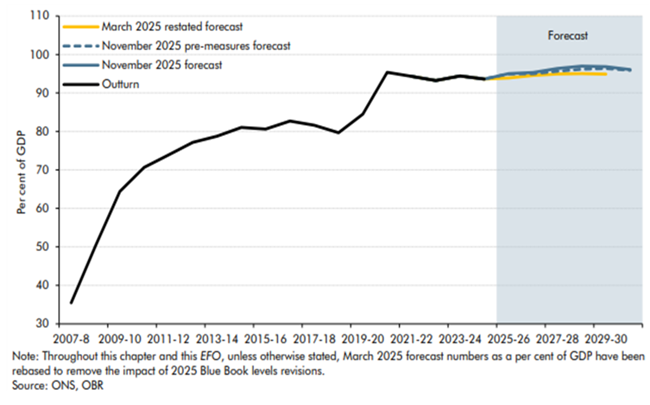 주: 이 장과 이번 EFO(경제·재정전망) 전반에서 별도 언급이 없는 한, 2025년 3월 전망 수치는 2025년 Blue Book 기준 개정의 영향을 제거한 뒤 GDP 대비 비율로 재산정한 값이다. 출처: ONS, OBR