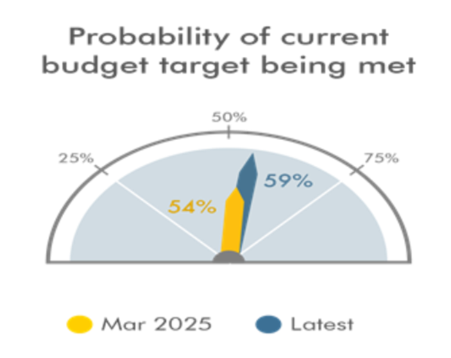 현재 예산 목표 달성 확률. 2025년 3월 전망: 54%, 최신 전망: 59%