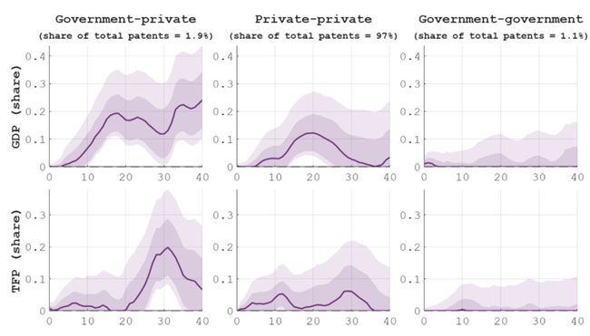 결과는 매우 인상적이다그림 1은 혁신의 거시경제 효과를 보여주는데공공–민간 특허(첫 번째 열)가 산출(첫 번째 행)과 생산성(두 번째 행모두에서 가장 큰 중기 효과를 보이며같은 기간 민간 부문 혁신(두 번째 열)의 효과를 두 배로 상회함을 보여준다정부가 자금을 지원했지만 민간이 소유한 특허는 민간 R&D 지출기업 투자실질 임금의 지속적 증가와도 연관된다공공–민간 특허는 전체의 2%에 불과하지만 중기 GDP와 TFP 변동의 약 5분의 1을 설명한다(그림 2). 여기서 보여주지 않은 공공–공공 특허를 통한 혁신은 평균 효과가 작지만 건강·생명공학 분야에서 가장 파괴적 돌파구를 비중 있게 포함한다이러한 결과는 열 가지 서로 다른 계량경제학 접근에서 모두 일관되게 나타나며정부가 자금을 지원하는 연구가 중기 생산성 향상의 핵심 동력임을 가리킨다.