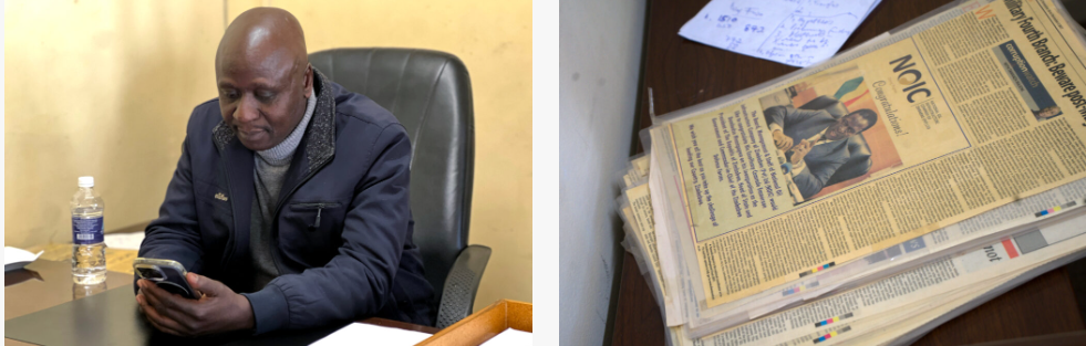 2025년 7짐바브웨에서 타완다 마조니(Tawanda Majoni)가 책상에 앉아옆에 쌓인 코팅된 신문 기사들을 바라보고 있다짐바브웨에서는 유력 인사들의 압력으로 뉴스 보도가 온라인상에서 삭제되는 일이 종종 발생한다출처케이티 수르마(Katie Surma) / Inside Climate News