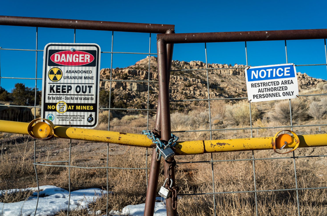 2020년 1월 13일, 뉴멕시코주 레드 워터 폰드(Red Water Pond) 지역의 버려진 우라늄 광산 입구 밖에는 건강 위험을 경고하는 표지판들이 세워져 있다.