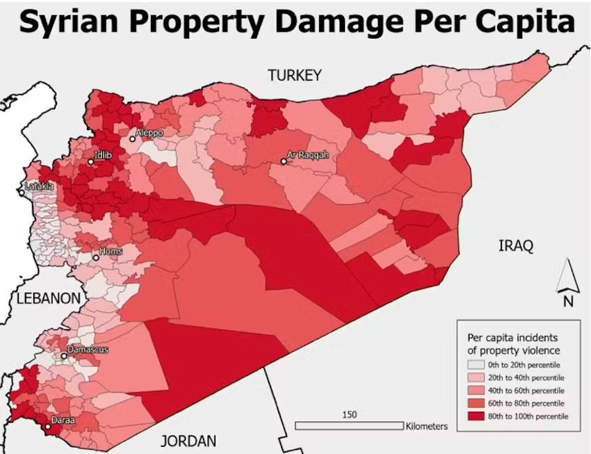 분쟁 감시 단체 ACLED가 2014년부터 2025년까지의 14만 건 이상의 폭력 사건 보고서를 분석한 결과, 재산 피해는 해안 지역보다 내륙 지역에서 더 집중적으로 발생했으며, 알레포, 이들립, 홈스 같은 도시는 특히 큰 피해를 보았다.