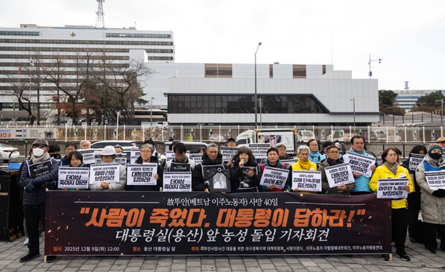 뚜안 씨는 지난 10월 28일 APEC을 앞두고 진행된 미등록 이주민 단속 과정에서 숨졌다. 그러나 법무부와 대구출입국관리소는 사망 원인을 개인적 과실로 규정하며 책임을 부정해왔고, 사고 경위나 현장 자료도 공개하지 않은 상태다. 이에 대구지역 노동시민단체들은 대책위를 구성하고 대구출입국관리소 앞에서 한 달이 넘게 천막농성을 해왔댜. 이들은 “정부가 아무런 입장을 내놓고 있지 않다”며 이날 기자회견 직후 용산 대통령실 앞에서 농성을 시작했다.