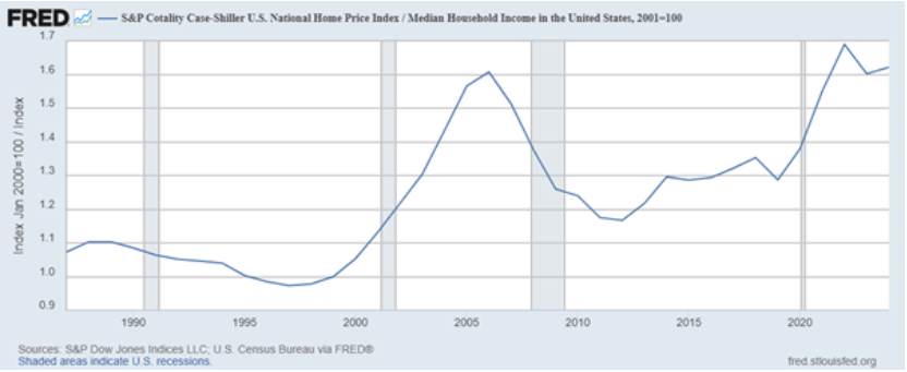 <S&P 코어로직 케이스-쉴러 미국 전국 주택가격지수> / 미국 중위 가구소득 비율, 2001년 = 100, 기준: 2001년 1월 = 100, 회색 음영 영역: 미국 경기침체기, 출처: S&P 다우존스 지수 LLC, 미국 인구조사국 (FRED를 통해)