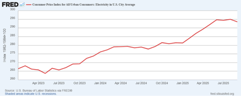 <전체 도시 소비자를 위한 소비자물가지수: 미국 도시 평균의 전기 요금>, (1982-1984년 = 100 기준), 기간: 2023년 4월 ~ 2025년 8월, 빨간 선: 전기 요금 CPI 변화, 출처: 미국 노동통계국 (FRED를 통해)