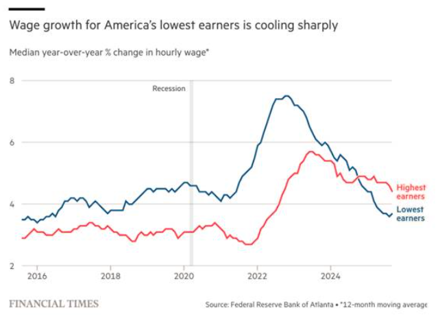 애틀랜타 연방준비은행은 미국 노동통계국(BLS)의 자료를 분석해 저소득층 임금 상승률이 고소득층보다 훨씬 더 가파르게 둔화했다고 밝혔다. 이는 지난 10년간 소득 격차를 줄여왔던 진전을 상당 부분 무너뜨렸다. 연방 최저임금은 2009년 이후 7.25달러로 동결된 상태이며, 이는 130만 명의 노동자들에게 영향을 주고 있다. 노동부에 따르면, 노동조합 가입률도 2022년에 10.1%로 역대 최저치를 기록하면서 유통업 같은 분야에서의 교섭력도 약화했다. 반면, AI 열풍과 금리 인하 기대, 법인세 감면 기대가 결합하면서 미국 주식시장은 사상 최고치를 경신하고 있다.