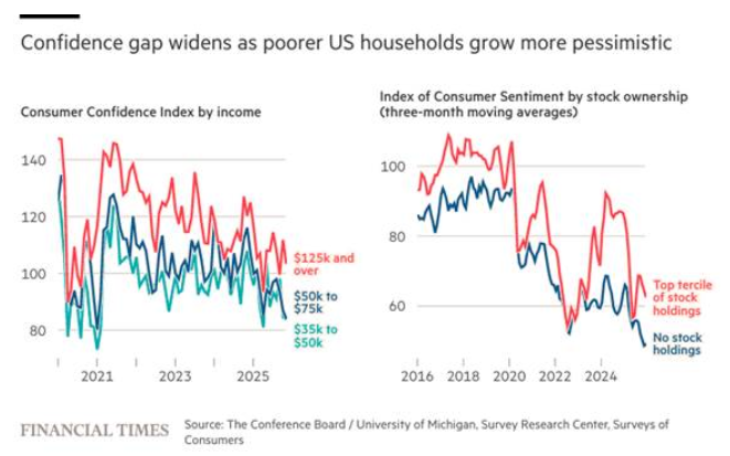 저소득층 가구는 임금 상승 둔화와 고용 둔화로 타격을 받고 있다. 트럼프 정부의 예산안인 ‘크고 아름다운 하나의 법안(One Big Beautiful Bill Act)’에 따라 많은 저소득층 미국인은 식료품 지원과 건강보험 보조금을 잃게 될 전망이다. 이에 따라 소득 하위 3분위 소비자들의 심리는 역대 최저치를 기록했다. CB의 소비자신뢰지수는 11월에 급락했으며, 6개월 평균 기준으로 월소득 1만 5천 달러 미만의 소비자들이 모든 소득 그룹 중에서 가장 비관적인 모습을 보였다.