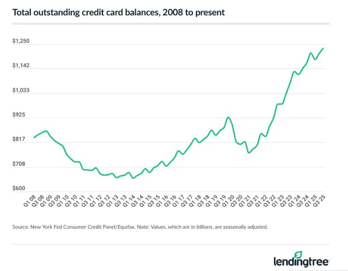 <총 미지불 신용카드 잔액, 2008년부터 현재까지>, 단위: 10억 달러 (billions), 2008년 1분기부터 2025년 3분기까지의 분기별 시점(Q1 08 ~ Q3 25), 출처: 뉴욕 연방준비은행 소비자 신용 패널 / 에퀴팩스(Source: New York Fed Consumer Credit Panel / Equifax)