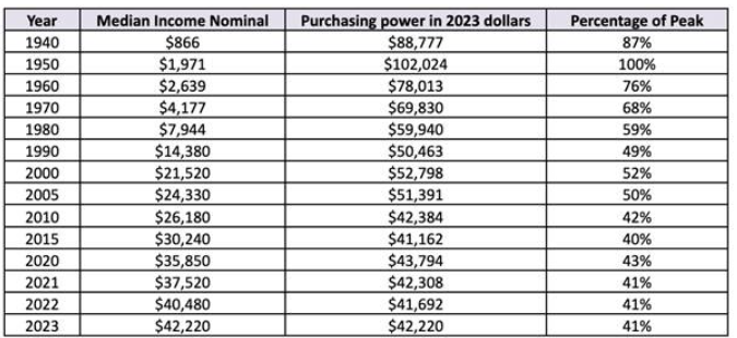 어떤 면에서 트렌트는 마르크스주의적 접근법을 사용했다. 즉, 가격 상승이 소득에 미치는 영향을 노동시간을 기준으로 측정한 것이다. 한 상품을 구매하는 데 필요한 노동시간을 기준으로 ‘가치’를 따지는 방식이다. 이 방법으로 분석해 보니, 1950년에 미국인의 조부모가 실제로 살 수 있었던 생필품을 2023년 기준으로 구입하려면 공식 중위소득 42,220달러가 아니라 102,024달러는 되어야 한다는 결과가 나왔다.