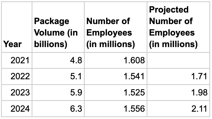2021년부터 2024년까지 아마존의 소포 물량, 실제 직원 수, 그리고 소포 물량 증가율과 같은 비율로 고용이 증가했을 경우 예상 직원 수는 표와 같다.