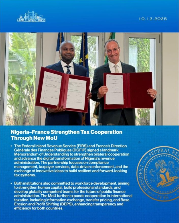 나이지리아–프랑스 세무 협력 관련 발표 (2025년 12월 10). (사진 내용)나이지리아 연방국세청(FIRS)과 프랑스 재무총국(DGFIP)은 양국 간 협력을 강화하고 나이지리아의 세무 시스템 디지털 전환을 촉진하기 위한 중대한 양해각서(MoU)를 체결했다이번 파트너십은 기업 관리납세자 서비스데이터 기반 집행혁신적 아이디어의 교류에 초점을 맞추며회복력 있고 미래지향적인 세무 시스템 구축을 목표로 한다양 기관은 공공 재정 행정 분야의 글로벌 인재를 양성하고인적 자본 강화전문성 향상역량 개발에 힘쓰며 인력 개발에도 공동으로 노력하기로 했다또한 이번 MoU는 국제 조세 협력을 확대하면서정보 교환이전가격소득이전 및 세원잠식(BEPS) 방지 등에 대한 협력도 포함하고 있다이를 통해 양국의 투명성과 효율성을 높일 수 있을 것으로 기대된다.
