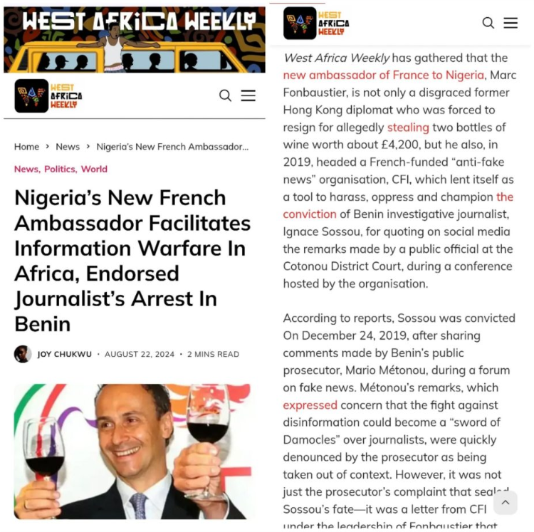 나이지리아의 신임 프랑스 대사아프리카에서 정보전을 조장하고 베냉 언론인 체포를 지지했다. West Africa Weekly 기사 (2024년 8월 22). (사진 내용)프랑스의 신임 나이지리아 주재 대사 마르크 퐁바스티에(Marc Fonbaustier)가 과거 아프리카 지역에서 정보전과 언론인 탄압에 관여한 전력이 드러나 논란이 일고 있다. <웨스트 아프리카 위클리>는 퐁바스티에 대사가 단순한 외교관 출신이 아니라과거 홍콩에서 와인 두 병(약 4,200파운드 상당)을 훔친 혐의로 사임한 이력이 있는 불명예스러운 인물이라고 보도했다그는 2019프랑스 정부가 자금을 지원하는 가짜 뉴스 반대’ 단체 CFI를 이끌며언론인 탄압 수단으로 해당 단체를 활용했다는 의혹도 받고 있다특히 그는 베냉 탐사보도 기자 이그나스 소수(Ignace Sossou)의 체포와 유죄 판결을 사실상 주도한 인물로 지목됐다소수 기자는 2019년 12코토누 지방 법원에서 열린 CFI 주최 포럼에서 공직자가 한 발언을 소셜미디어에 인용해 게시한 뒤 체포됐다그가 인용한 발언은 베냉의 당시 검찰총장 마리오 메토누(Mario Mètonou)가 가짜 뉴스 대응이 자칫 언론인에게 다모클레스의 검이 될 수 있다고 경고한 내용이었다하지만 베냉 검찰은 해당 발언이 맥락 없이 왜곡되었다고 주장했고결국 소수 기자는 2019년 12월 24일 유죄 판결을 받았다이번 사건은 단순히 검찰의 반발 때문만이 아니라, CFI와 퐁바스티에의 개입으로 인해 언론 자유가 침해됐다는 비판을 받고 있다.