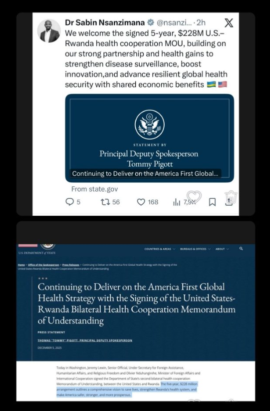 (사진 내용)르완다-미국 보건 협정 관련 발표 및 기사우리는 미국-르완다 간 5년간 2억 2,800만 달러 규모의 보건 협력 양해각서(MoU) 체결을 환영한다이번 협정은 양국의 강력한 파트너십과 보건 성과를 기반으로 질병 감시를 강화하고혁신을 촉진하며회복력 있는 글로벌 보건 안보를 공동의 경제적 이익과 함께 발전시키는 데 기여할 것이다./ 미 국무부 수석 부대변인 토미 피곳의 성명: “아메리카 퍼스트 글로벌 보건 전략 이행을 지속하겠다...”