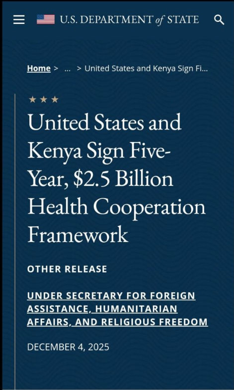 미국 국무부 발표케냐와 보건 협정 체결미국과 케냐, 5년간 25억 달러 규모의 보건 협력 프레임워크에 서명하다해외 원조·인도주의·종교자유 담당 차관, 2025년 12월 4