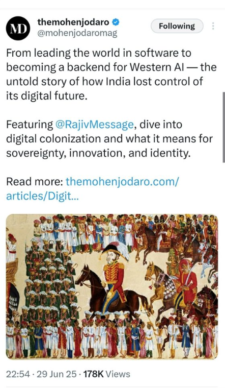 (사진 내용)소프트웨어 강국에서 서구 AI의 하청 기지로 전락하기까지 — 인도가 어떻게 디지털 미래의 통제권을 잃었는지에 대한 숨겨진 이야기다라지브 말호트라(@RajivMessage)가 출연해 디지털 식민화가 주권혁신정체성에 어떤 의미를 가지는지 깊이 있게 다룬다.