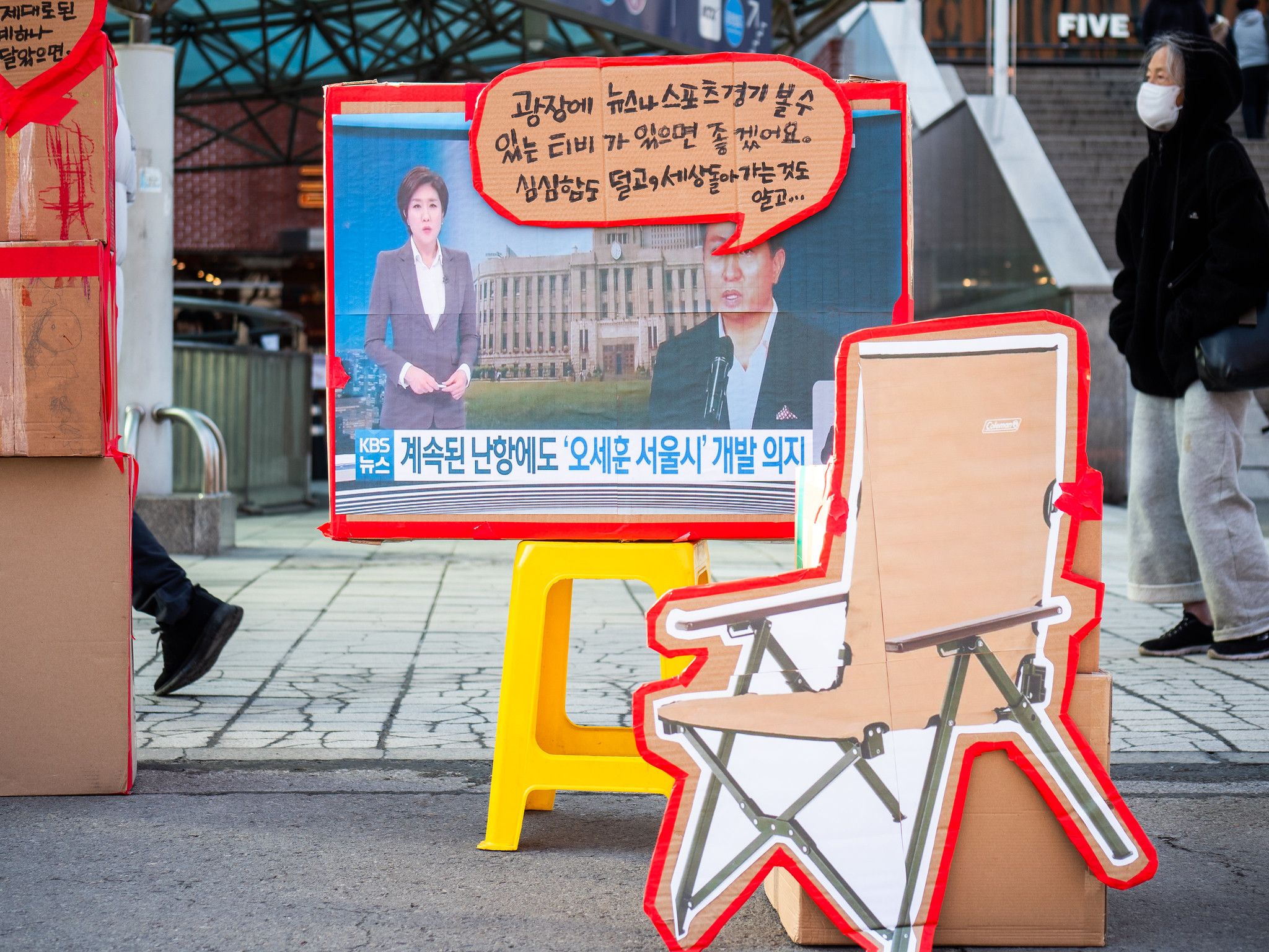 구조물을 설치한 서울역의 기둥과 〈공짜 의자가 필요해〉 전시. 참세상.