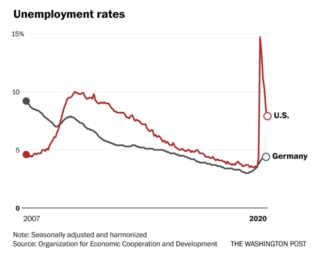 그러나 이것이 놀라운 일일까. 2020년 미국의 ‘노동시장 정책’은 실업이 급증하도록 방치한 뒤 현금 수표를 뿌리는 방식이었다. 당연히 노동생산성은 급등했다. 반면 유럽은 사실상 공식적으로 저생산성을 떠받치는 셈인 단시간 뇨둉 유지 제도를 지원하는 데 막대한 재정을 투입했다. 이 제도를 기억하는가.