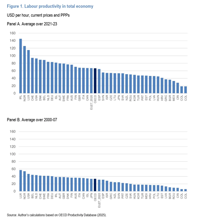하지만 다른 자료들을 보면 이야기가 달라진다. OECD의 시간당 노동생산성 자료나 드라기와 유럽중앙은행이 사용하는 AMECO 데이터베이스를 보면, 미국과 유럽 간 생산성 격차는 대중적 서사가 말하듯 극적이지는 않지만, 분명히 존재한다.