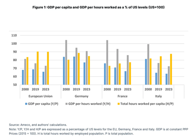논의를 위해, 유럽의 기술관료 엘리트가 자기 이해관계를 대변하며 위기를 과장해 만들어내고 있는 것은 아니라고 가정해 보자. 또한 다수의 경제 연구에서 사용하는 OECD–AMECO 자료가 실제로 중요한 현실을 보여주고 있다고 가정해 보자. 그렇다면 상황은 프랑스 중앙은행이 묘사한 그림과 유사해진다. 시간당 생산성 측면에서 유럽은 미국과의 격차가 바람직하지 않은 방향으로 벌어지고 있으며, 이를 더 긴 노동시간으로 보완하고 있다는 것이다. 이는 영국에서도 확인되는 이야기다.