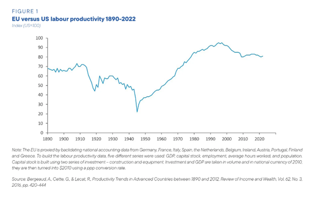 EU 대 미국 노동생산성, 1890~2022년. 지수(미국=100)