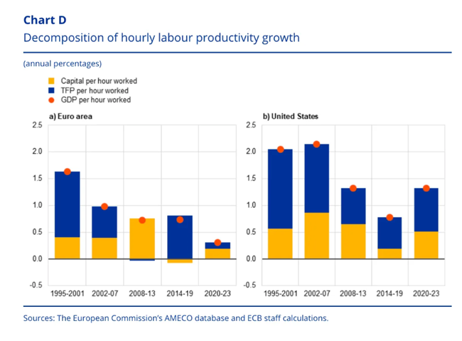 시간당 노동생산성 증가의 분해 (연평균 증가율) 출처: 안토니우 디아스 다 실바(António Dias da Silva), 파올라 디 카솔라(Paola Di Casola), 라몬 고메스 살바도르(Ramon Gomez-Salvador), 마티아스 모어(Matthias Mohr), 유럽중앙은행(ECB).