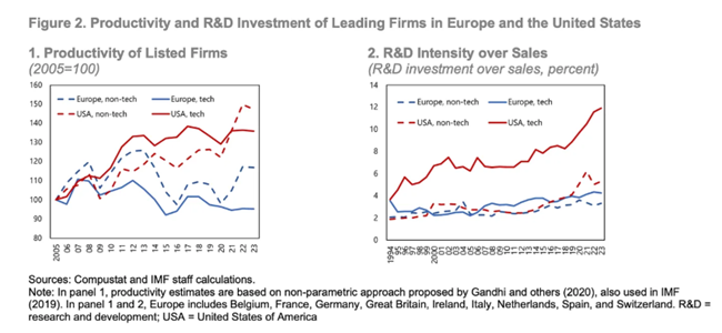 유럽과 미국 선도 기업들의 생산성과 연구개발(R&D) 투자. 출처: 오윤 에르데네 아딜비시(Oyun Erdene Adilbish) 외, 국제통화기금(IMF)