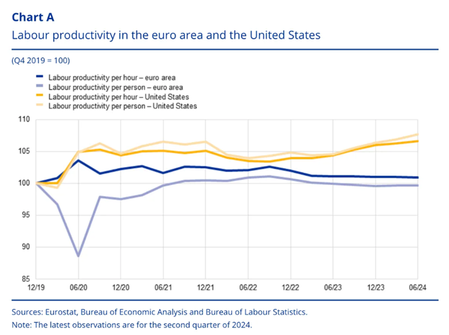 2019년부터 2024년 사이 미국과 유럽의 생산성 격차는 다시 상당히 뚜렷하게 벌어졌다. 처음에는 팬데믹 자체의 충격 속에서, 그리고 2022년 이후에는 우크라이나 전쟁의 영향 속에서 그 격차가 확대됐다. 이는 분명 현재 유럽에 퍼져 있는 침체감, 이른바 ‘EU의 우울’에 기여했다. 최근 몇 해가 혹독했던 것은 사실이다.
