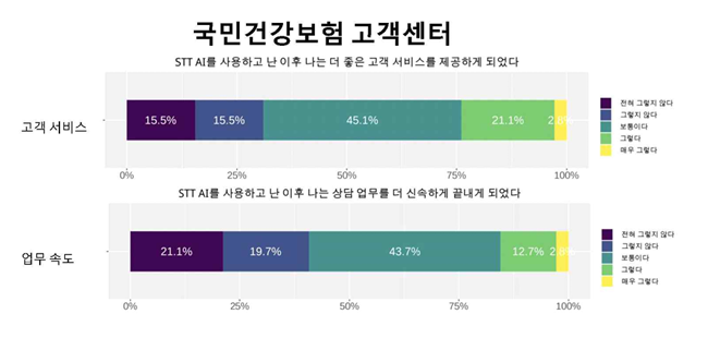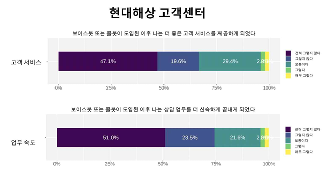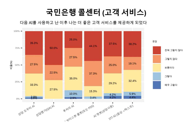 이날 발표한 실태조사 결과 AI 도입 이후 서비스의 질은 떨어진 것으로 드러났다김정훈 코넬대학교 노사관계 대학 박사과정은 토론회에서 실태조사 결과를 발표하며 업무를 자동화하는 AI보다 상담을 보조하는 AI에 대해서만 제한적인 긍정 평가가 나타났다며 무분별한 자동화가 오히려 현장 효율을 떨어뜨리고 있다고 밝혔다실태조사는 공공·금융 콜센터 7상담사 382명을 조사했으며, AI 도입 이후 상담 품질이나 업무 속도가 개선됐다고 응답한 비율은 절반에 미치지 못했다특히 콜봇과 보이스봇에 대해서는 70~80%가 고객 서비스에 도움이 되지 않는다고 응답했다.