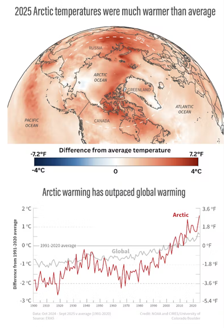 2024년 10월부터 2025년 9월까지의 지난 수문 연도는 125년 전 관측이 시작된 이래 가장 높은 북극 기온을 기록했다. 이 기간에는 관측 이래 가장 따뜻한 가을이 포함되었고, 겨울과 여름 역시 기록상 가장 따뜻한 해들 가운데 하나였다. 전체적으로 볼 때 북극은 지구 전체 평균보다 두 배 이상 빠른 속도로 온난화되고 있다.