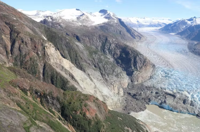 항공 사진은 후퇴하는 빙하와 영구동토층 융해 가능성이 노출된 계곡 사면에 어떤 영향을 미쳤는지를 보여준다. 2025년 8월 10일 알래스카 사우스 소여 빙하에서 발생한 산사태의 결과를 담은 항공 사진이다. 산비탈의 밝은 부분이 붕괴가 발생한 지점이다. 출처: 미국 지질조사국