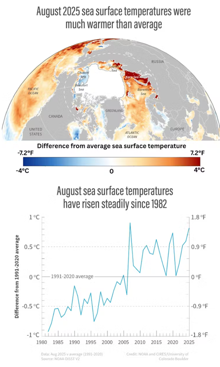 북극해의 표층 수온은 꾸준히 상승하고 있으며, 2025년 8월의 수온은 관측 사상 가장 높은 수준 가운데 하나였다. 대서양 구역의 일부 지역에서는 해수면 온도가 1991~2020년 평균보다 화씨 13도, 섭씨 7.2도까지 높았다. 반면 추크치해와 보퍼트해의 일부 지역은 평년보다 더 서늘했다.