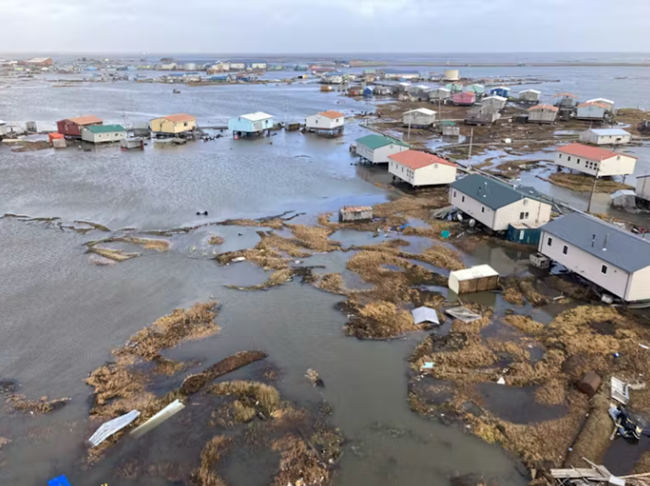 2025년 10월 12일 촬영된 킵눅 마을은 전 태풍 할롱으로 초토화되었다. 이 폭풍으로 알래스카 서부 전역에서 최소 1,500명이 삶의 터전을 잃었다. 출처: 알래스카 주방위군