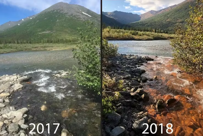 융해되는 토양이 철과 기타 광물을 방출하면서, 알래스카 북극 전역의 200개가 넘는 유역에서 주황색 변색이 관측되고 있다. 이 물들은 산성이 더 높고 독성 금속 농도도 상승해, 어류 서식지와 식수를 오염시키고 자급적 생계에 영향을 미칠 수 있다.