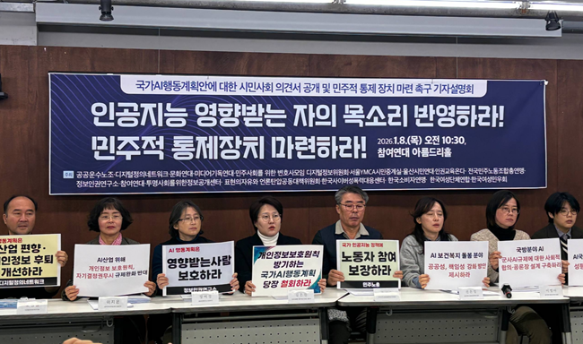 정부가 추진 중인 대한민국 인공지능 행동계획()’을 둘러싸고 시민사회가 기술과 산업 중심의 속도전이 시민의 권리와 안전을 위협하고 있다며 정책 전환을 촉구했다노동·인권·여성·문화·평화 분야 시민사회단체들은 8일 기자설명회를 열고 이번 정부의 행동계획이 AI의 위험을 통제할 장치와 민주적 거버넌스를 갖추지 못한 채 기업 중심으로 설계됐다고 지적했다.
