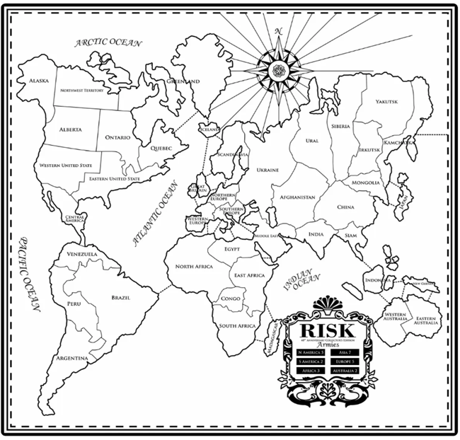 보드게임 〈리스크(Risk)〉의 세계 지도판. RISK: The Game of Global Domination. 세계 지배 게임