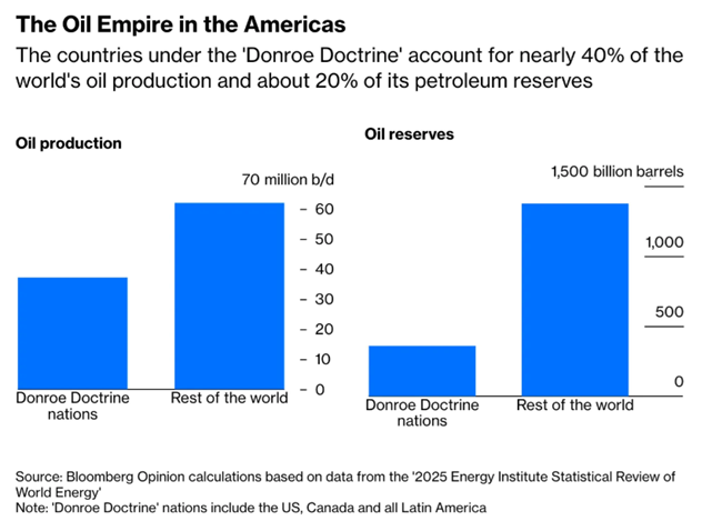 돈로 독트린’ 아래에 놓인 국가들은 전 세계 석유 생산의 약 40%, 전 세계 석유 매장량의 약20%를 차지한다출처블룸버그 오피니언 분석. 에너지 연구소 세계 에너지 통계 연감기반