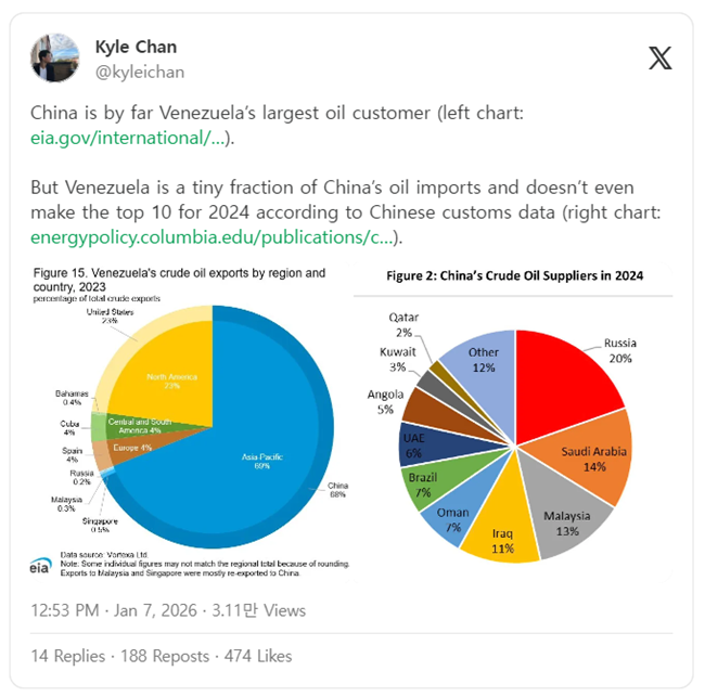 중국은 베네수엘라의 석유를 가장 많이 사들이는 나라다. (왼쪽 차트 출처: eia.gov/international/그러나 베네수엘라는 중국 전체 석유 수입에서 차지하는 비중으로 보면 극히 작은 부분에 불과하며중국 세관 자료 기준으로는 2024년 상위 10위 공급국에도 들지 못한다. (오른쪽 차트 출처: energypolicy.columbia.edu/publications/)