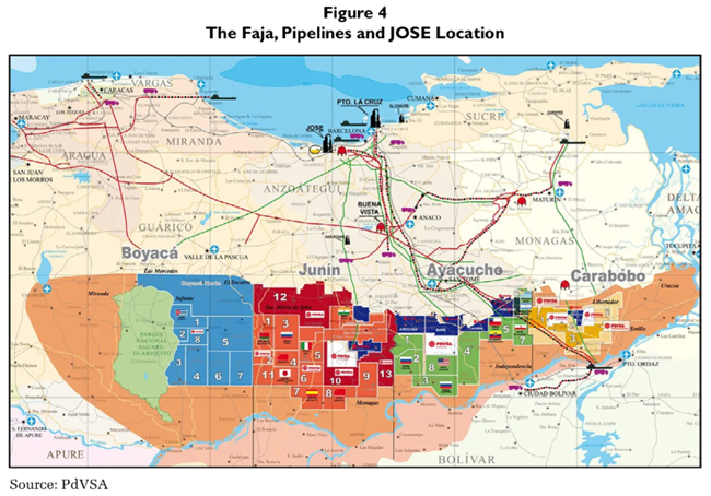 <파하(Faja), 파이프라인그리고 호세(JOSE)의 위치지도는 베네수엘라 오리노코 석유 벨트 지역을 중심으로 석유 블록(색상과 번호로 구분됨). 원유·가스 파이프라인 경로 호세 산업 단지 및 수출 터미널의 위치를 함께 보여준다.