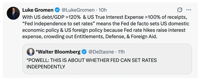 미국의 부채/GDP 비율이 120%를 넘고실제 이자 지출이 세입의 100%를 초과하는 상황에서, ‘연준이 독립적으로 금리를 결정한다는 것은 사실상 연준이 미국의 국내 경제 정책과 대외 정책을 좌우한다는 뜻이다연준이 금리를 인상하면 이자 지출이 급증하고그 결과 사회보장 지출국방비해외 원조가 밀려난다.”