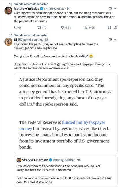 디제이(DJ, @DjsokeSpeaking) 정말 믿기 어려운 점은그들이 수사를 그럴듯하게 보이도록 하려는 시도조차 하지 않는다는 것이다연준 건물 리노베이션을 이유로 파월을 겨냥하는 것은 법무부가 세금 낭비 남용을 수사하겠다는 성명을 내는 꼴이다그런데 연방준비제도는 세금으로 운영되지 않는다.”
